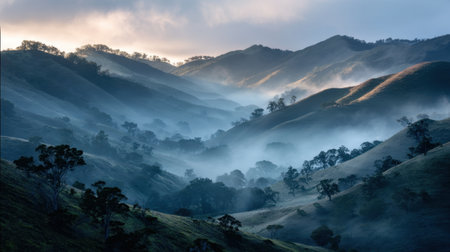 Experience the breathtaking beauty of a misty landscape at dawn, showcasing rolling hills and soft light filtering through trees.
