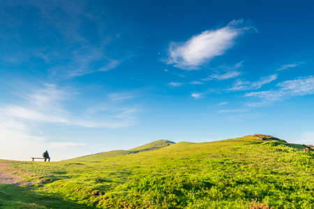 A distant figure,silhouetted by the summer light at sunrise,sitting and resting after walking the slopes with heavy bag,taking in the beautiful scenery of the Malverns on a bright,warm summer's day.