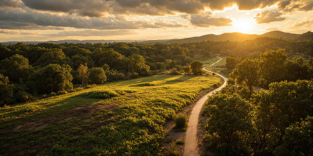 A breathtaking landscape at sunrise displays rolling hills and misty terrain. Golden meadows and lush trees create a tranquil scene bathed in warm morning light.
