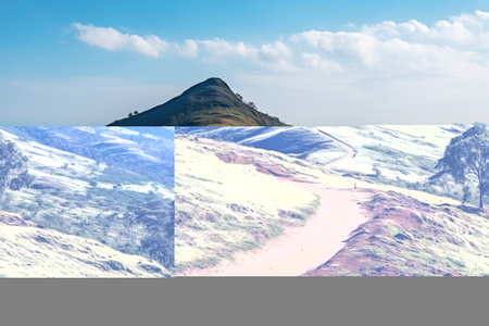 the photo showcases a snow-covered mountain with minimal retouching, featuring a blend of light green and amber hues. it captures the essence of traditional british landscapes, reminiscent of national geographic photos. the image exudes a pastoral charm and has been rendered using octane render in cinema4d. ai generated