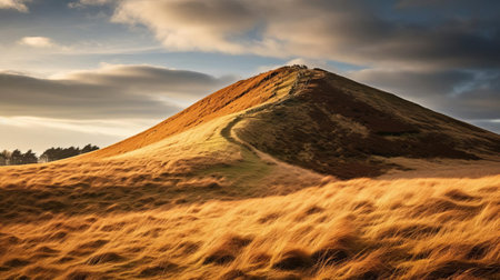 A serene landscape featuring a rounded hilltop silhouetted against a vibrant sunset, with golden light filtering through the clouds and illuminating the foreground grass.