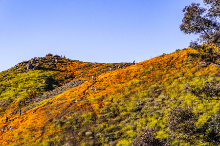 March 16, 2019 Lake Elsinore / CA / USA - People visiting the Walker Canyon area during the superbloom; California poppies blooming on the mountain ridges and valleys