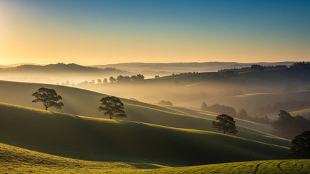 A stunning view of rolling green hills bathed in soft morning light, showcasing nature