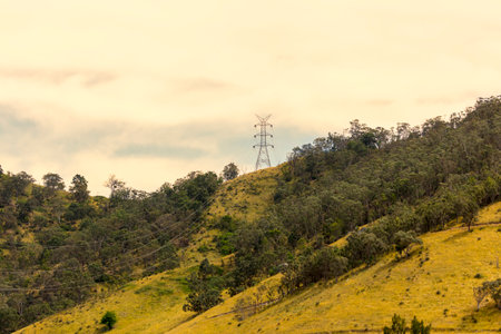 Photograph of a large steel electricity Transmission Tower on a grassy hill in regional Australia.