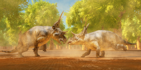 Diabloceratops Dinosaur Fight Two Diabloceratops dinosaurs fight for mating rights during the Cretaceous Period of Utah North America.