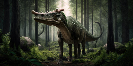 Big model of prehistoric dinosaur in nature. Realistic scenery