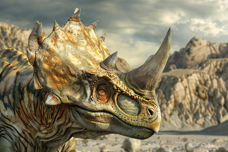 A lifelike Centrosaurus dinosaur in a dry, rocky prehistoric landscape with sparse vegetation and a dramatic cloudy sky.