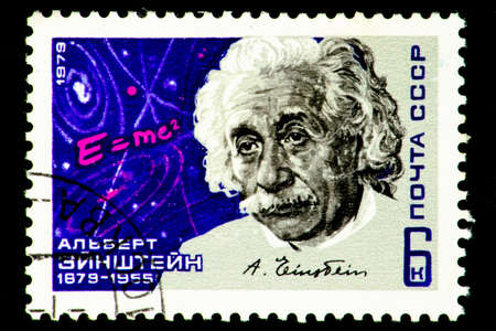 07.24.2019 Divnoe Stavropol Territory Russia Postage stamp USSR 1979 Albert Einstein 1879-1955 portrait with autograph on the blue background