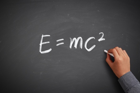 Albert Einsteins famous matematical equation e=mc2 written on a chalkboard.