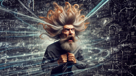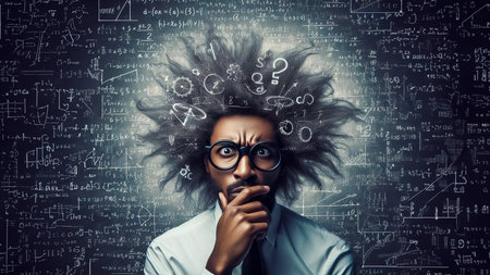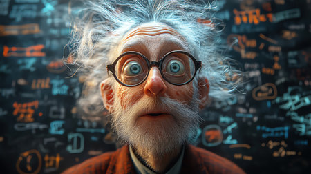 A surprised scientist with wild hair and large glasses shows shock in a laboratory setting, surrounded by a blackboard filled with complex scientific equations and notes.