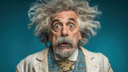 A scientist expresses astonishment with messy hair and wide eyes against a vibrant blue background.