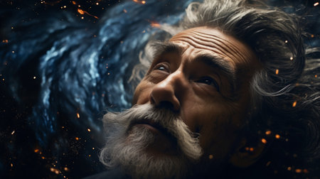 An elderly man with deep blue eyes gazes intensely while surrounded by a mystical display of electricity.