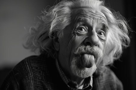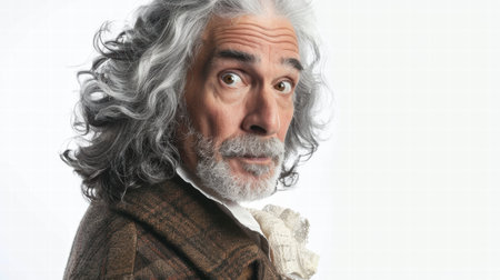 A scientist with disheveled hair shows surprise in a dramatic studio portrait.