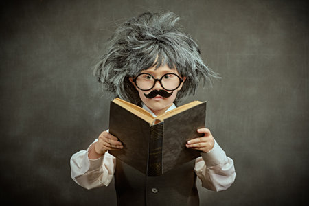 Cute little kid in glasses, with a mustache and in a wig, like little professor holds a book with surprise. Background of a blackboard with copy space. Education and early development. Little Scientists.