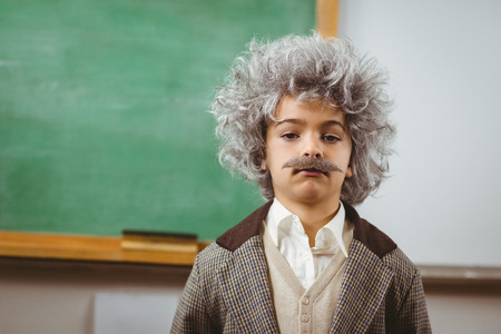 Portrait of cute pupil dressed up like Einstein in a classroom in school