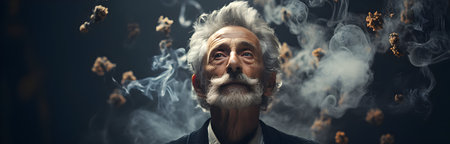 Portrait of an old man smoking a cigarette. Smoke is flying around him.