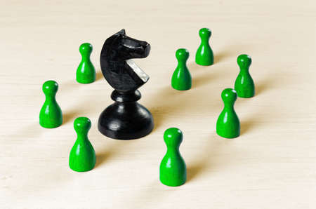 Big black knight chess piece surrounded by smaller green pawns on a white wooden table