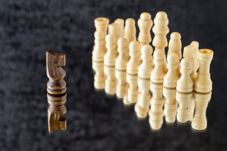 Silver chess knight is facing golden chess king on black background. Business strategy, market share, business competition, opportunity, brave, fearless, dare or challenge concept.