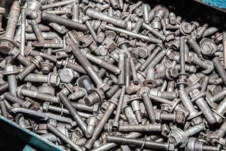 Mix of old different hardware screws, bolts, nuts, washers in a box of a home craftsman close-up