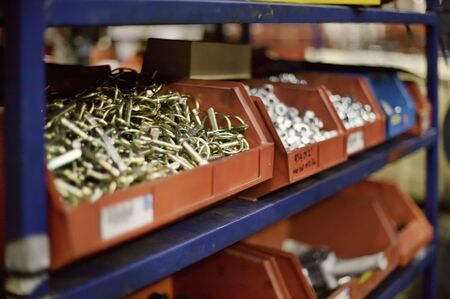 Various hardware, nails, screws and bolts in boxes. Home workshop. Top view
