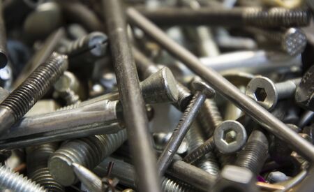 Pile of fasteners and screws close up. metal scrap. different metal details