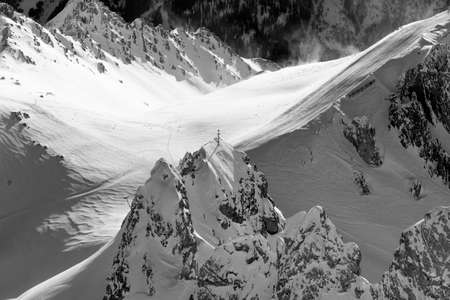Spectacular winter mountain panorama with peaks covered with early snow.
