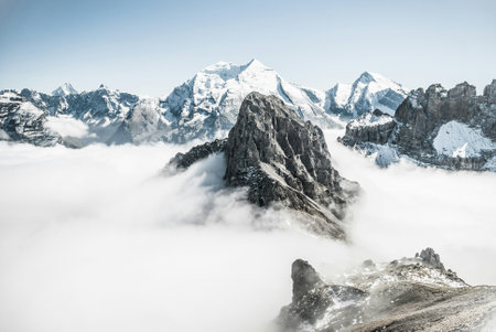 View on the mountains covered in fog from Mangart Pass that connects Italian and Slovenian side, Mangart pass
