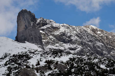 Beautiful Alps with snow on high rocky mountain in Alps, under cloud sky