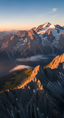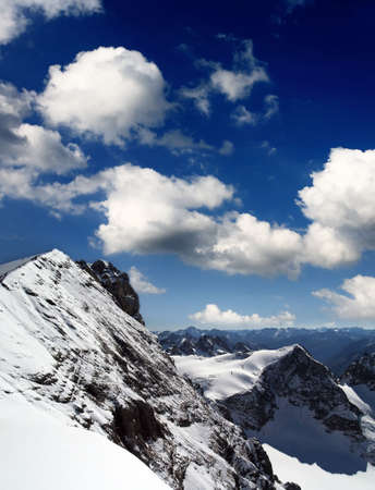 Panoramic view of the German and Austrian Alps in sunset from the Zugspitze Glacier, Germany