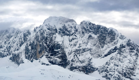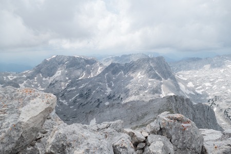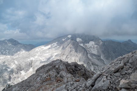 A scenic view of the Misty mountain peak of Mount Mojstrovka in the Julian Alps in Slovenia