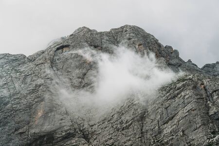 The limestone peaks in clouds over Gosau Valley in Dachstein massif, Austrian Alps, Europe