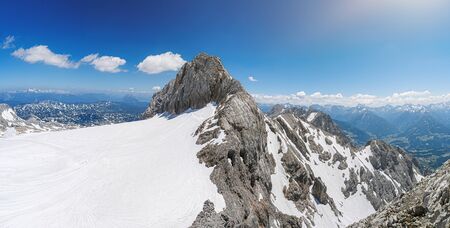 Panoramatic view from peak of Dachstein am Ramsau mountain in Alps in Austria.