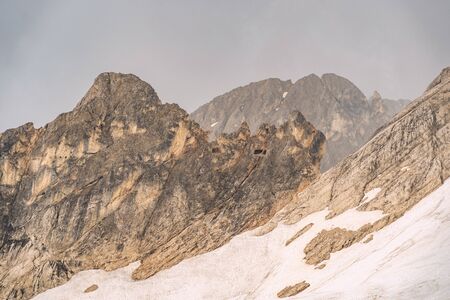 Cold panoramic view of Germanys largest mountain Zugspitze peak alpine landscape with snow rocks hills clouds and mountains in the Alps Biberwier Reutte Tyrol Austria.