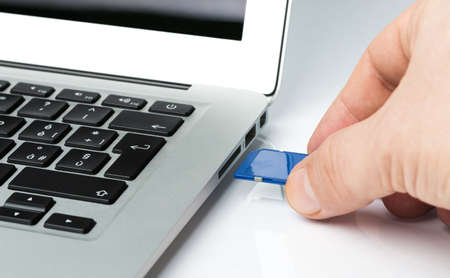 A removable flash drive is connected to the laptop to read information. Copy space. Selective focus.