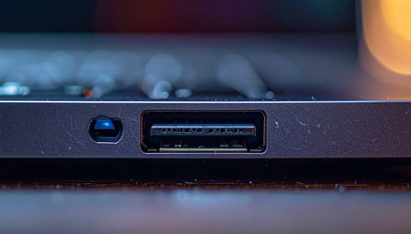 A macro shot captures the sleek design of a modern laptop's SD card reader slot.