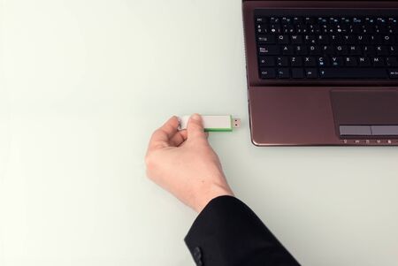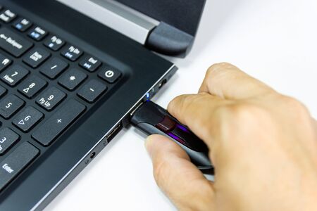 Hand of a businessman holding a USB device connected to Laptop computer on white table in The office.