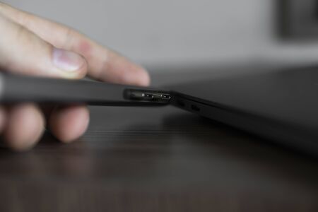 Close up of hand inserting plugging data cable into usb port in laptop, data transfer concept