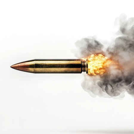 Dynamic image of a bullet in motion surrounded by flames and sparks, capturing intense action energy