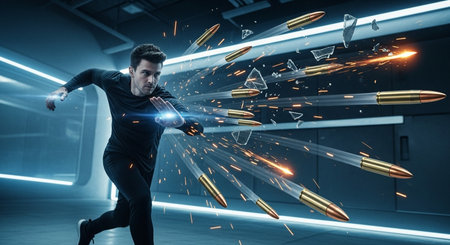 a man deflects bullets with an energy shield in a modern room with shattered glass and bright light effects This image features a transparent background, making it versatile for various design projects.