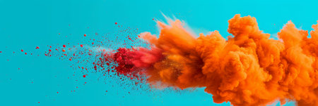 A stunning visual of vibrant orange powder bursting against a bright blue background, symbolizing energy, creativity, and artistic expression in action.