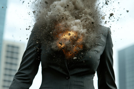 Explosion in office, businessman shocked, chaos in financial environment.