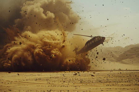 A powerful explosion sends debris and smoke into the air, creating chaos in a barren desert at midday.