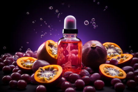 Product image sleep well with passion fruit and violet background. Beauty or cosmetic industry. Glass bottle