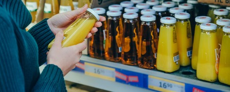 Man in a store holds a can of orange juice in his hand against the backdrop of a rack