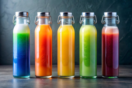 A collection of glass bottles filled with vibrant fruit juices sits beside fresh berries and herbs on a colorful table, surrounded by a scientific backdrop hinting at innovation.