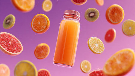 A vibrant collection of fresh fruits surrounding a bottle of orange juice, representing health and vitality.
