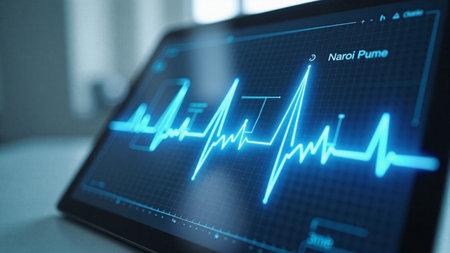 A close-up of a digital heart rate monitor displaying a heartbeat waveform, vibrant green lines against a dark background, illustrating medical technology