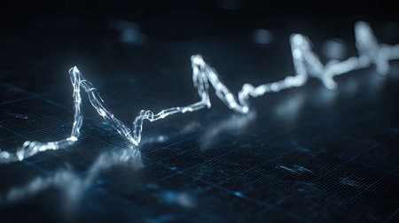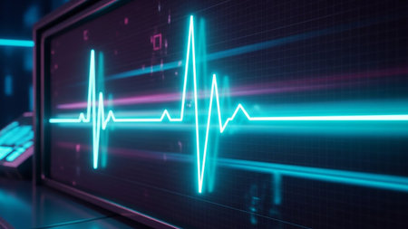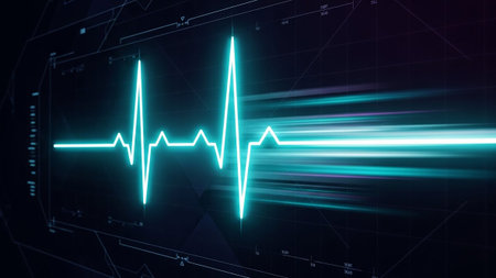 A digital representation of heart rate is displayed with a glowing pulse line fluctuating in a rhythmic pattern against a dark background, conveying a sense of life and vitality.