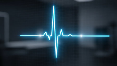 A bright blue electrocardiogram line pulses with energy against a dark, abstract background, symbolizing health and technology.