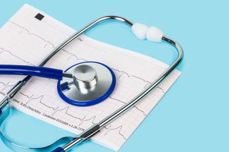 Close-up of healthy electrocardiogram results. A tool for studying breathing and heartbeat. Blue doctor's stethoscope. The concept of maintaining a healthy heart.